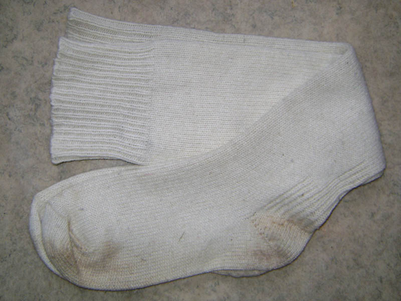 often "hose tops" rather than socks. The standard ensemble was to put on your DR breeches, then your standard grey-wool calf-length woolen Army-issue socks. You then slipped on a pair of khaki-woollen knitted "hose